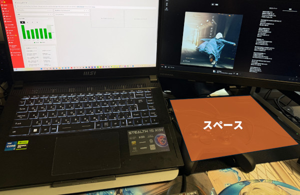 目は上下の移動が多いと疲れやすくなってしまうので、サブディスプレイはメインディスプレイの真横に配置したい。