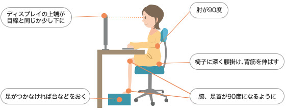 目がもっとも疲れにくいようにするためには、「ディスプレイの上端が目線と同じか少し下に」来るようにするとよいらしい。