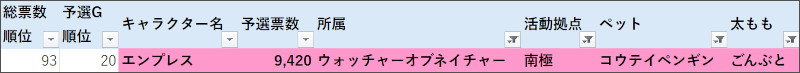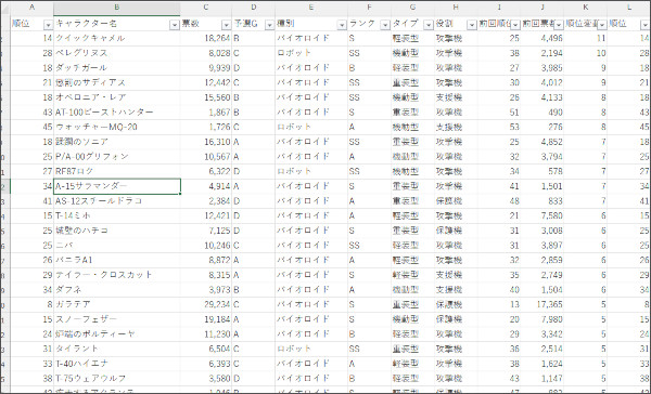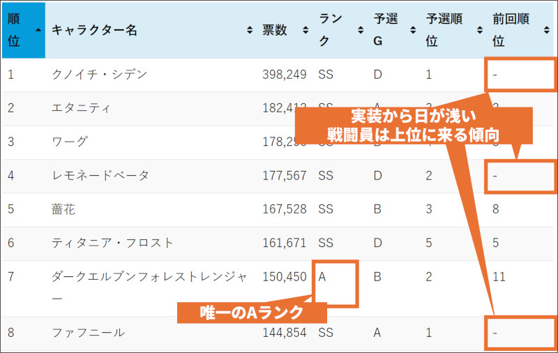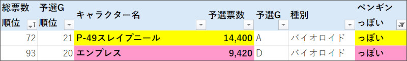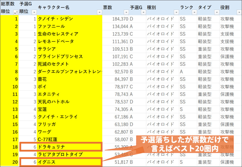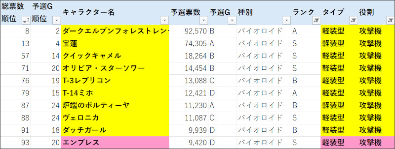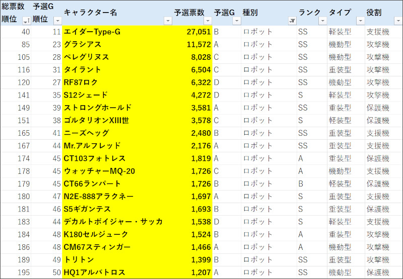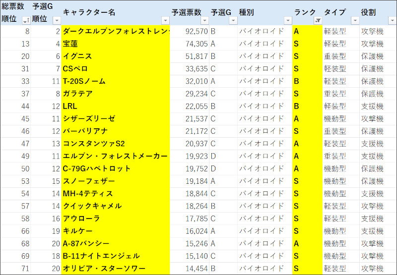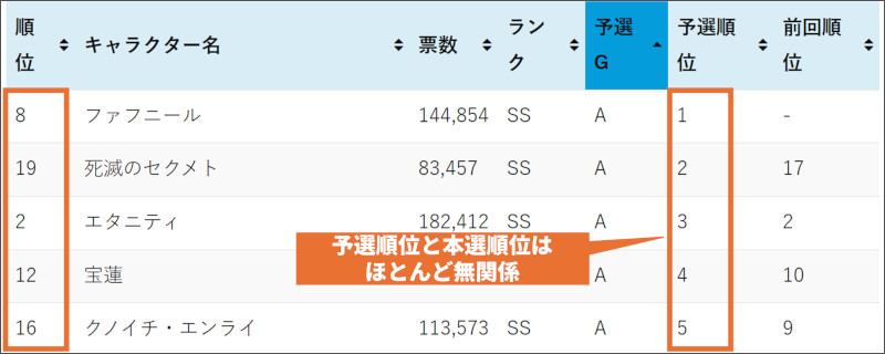 | 総票数順位 | 予選G順位 | キャラクター名 | 票数 | 予選G | 種別 | ランク | タイプ | 役割 | 前回予選順位 | 前回予選票数 |