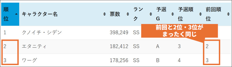 | 順位 | キャラクター名 | 票数 | ランク | 予選G | 予選順位 | 前回順位 |