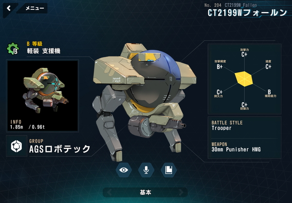 | 204 | 51 | CT2199Wフォールン | 837 | C | ロボット | B | 軽装型 | 支援機 | 53 | 23 |