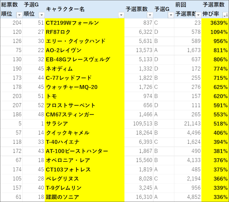 前回(第2回)の予選票数と今回(第3回)の予選票数を比較して、伸び率が大きい順に並べた。なお、伸び率は本記事上部の表には載せていないので、この画像だけのデータ。