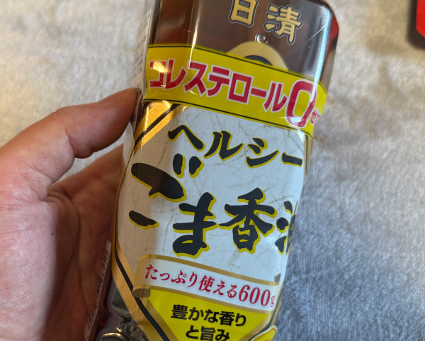 健康に優しくて香りのよい、日清のヘルシーごま香油。前述のツナサラダやチャーハンによく使う。もちろんその他の炒め物もろもろにも使える。