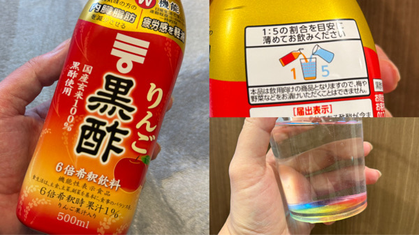 水で6倍に薄めて飲むリンゴ酢。飲めるリンゴ酢はほかにもいろいろあるし、同じミツカンでも複数あるのだが、これがダントツでおいしいと思う。希釈飲料なので冷蔵庫内の場所も取らない。