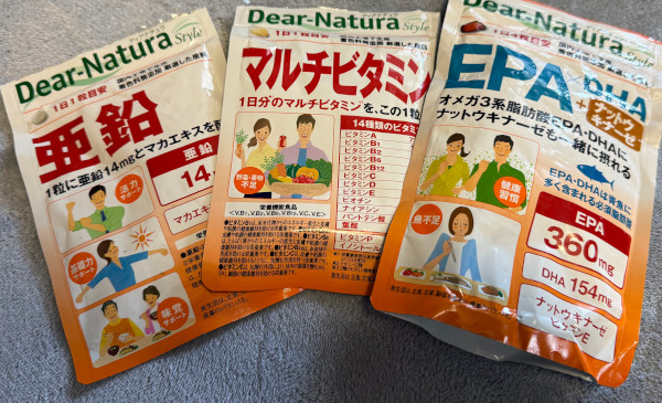 亜鉛とマルチビタミンは何年も前から飲んでいて、EPAは半年~1年前くらいから飲んでいる。日ごろから青魚をしっかり食べていればEPAは不要なのだが、そんなに頻繁には食べられないので、サプリである程度補っている。