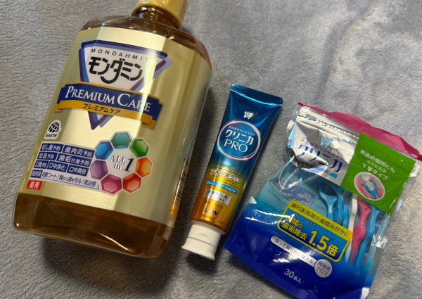 モンダミンはお出かけ前と就寝前のうがい用、クリニカPROは毎日の歯磨き用、Y字フロスは1~2日に1回、歯の隙間をしっかり掃除する用。