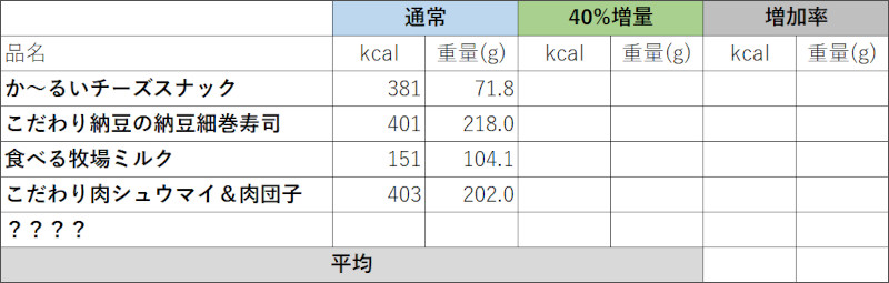 まあ、正直これはきっちり40%増量でほぼ間違いないだろう。過去の傾向と、スナック菓子は内容量管理が重要であることからして、上にも下にもずらす必然性があまりない。