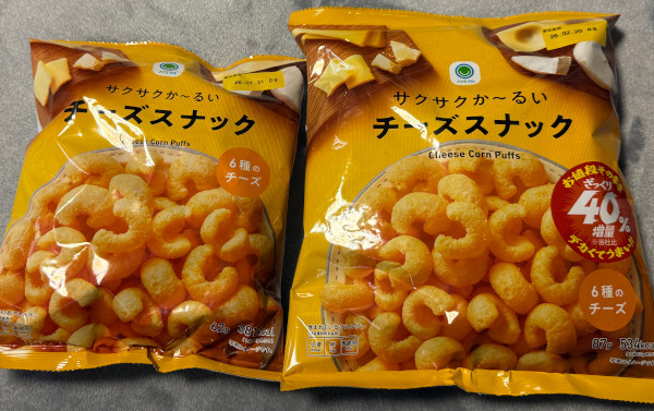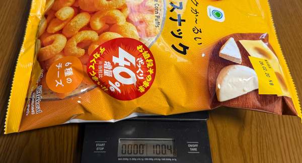 だいぶデカい。増量された結果けっこう重いし、1袋で534kcalもある。なにが「か~るい」だ! この時期だけ「お~もいチーズスナック」に改名しろ!