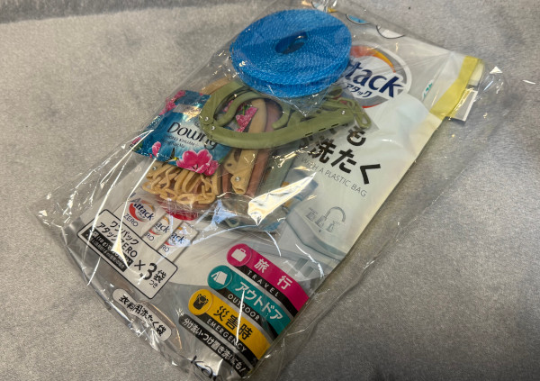 ちなみに、物干しロープがないタイプや、洗濯袋と洗剤のみのタイプもある。ぼくが買った全部入りのやつはショップによっては変に高い価格になっていることがあるので、よく見て買おう。キャンプならともかくホテルならロープを使うことはあまりないので、あえて全部入りを買う必要性は低いだろうし。