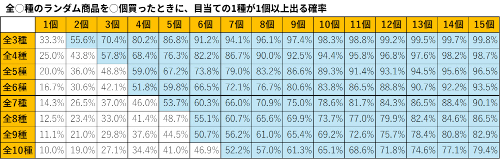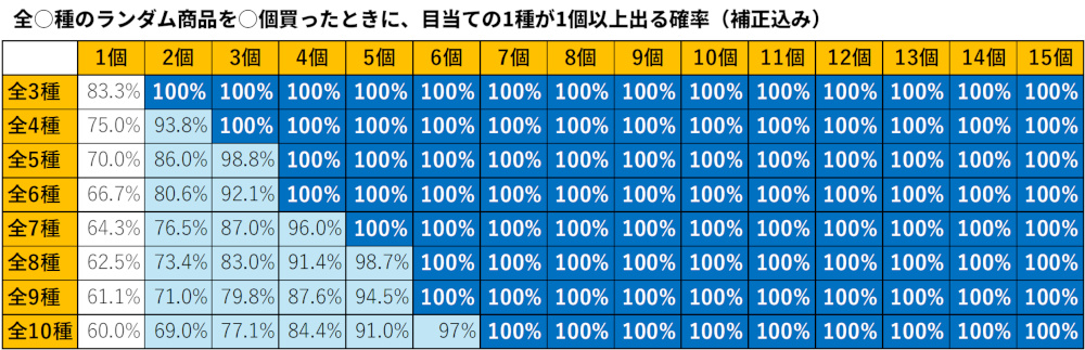 今後、ほかのランダム商品でも使えるように、「全○種のランダム商品を○個買ったときに、目当ての1種が1個以上出る確率」を一覧化しておいた。ぜひご活用いただきたい。