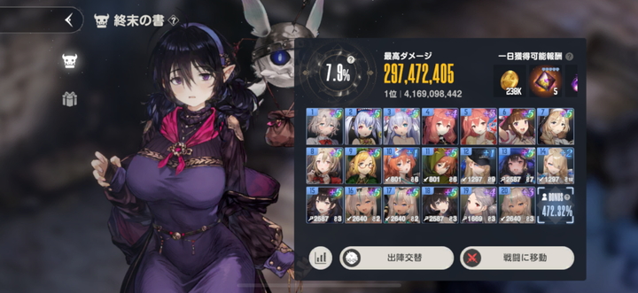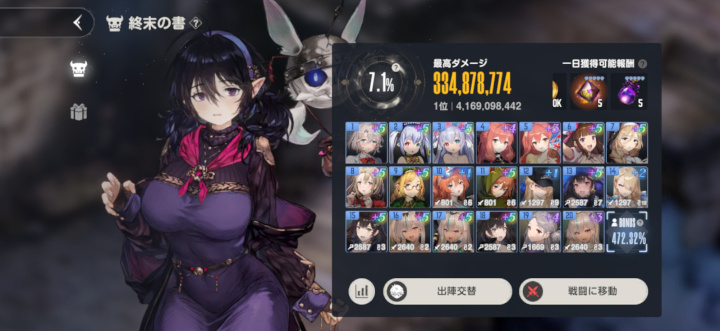 でもここまで来ると、もっと上をめざしたくなるな。正直、シェラザードを外してほかのキャラにすればもっと伸びそうな気がする。シェラザードは強いが、与ダメージだけに限ればより優秀なアタッカーはいるので、めちゃくちゃシェラザードが好きでいつもシェラザードのクッションをスハスハしながら寝ているとかでもない限りは使い続ける理由がない。