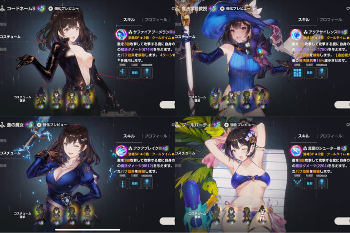 たとえば、シェラザードのコスチュームを3つ持っていたとしたら20枠中3枠をシェラザードにできるわけだが、レベルや装備は3枠すべて共通なので、3枠なのに育成はほぼ1人ぶんで済む。これは育成リソースが限られがちな初心者にとってかなりありがたい。