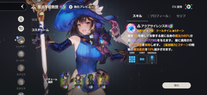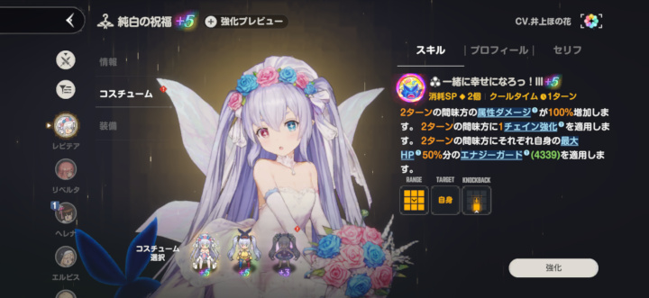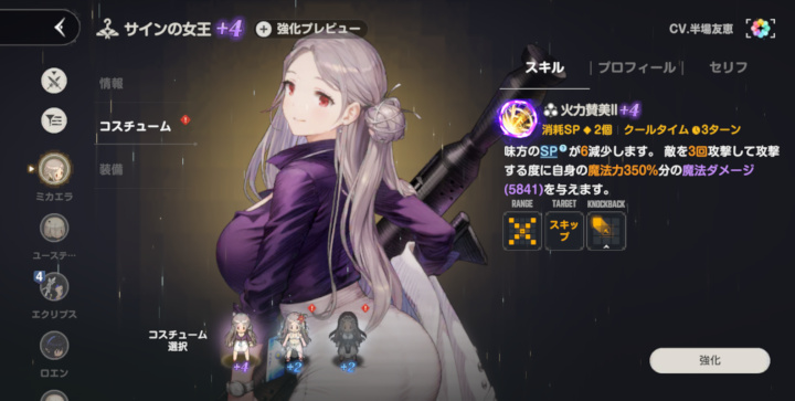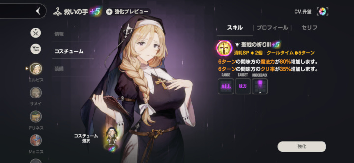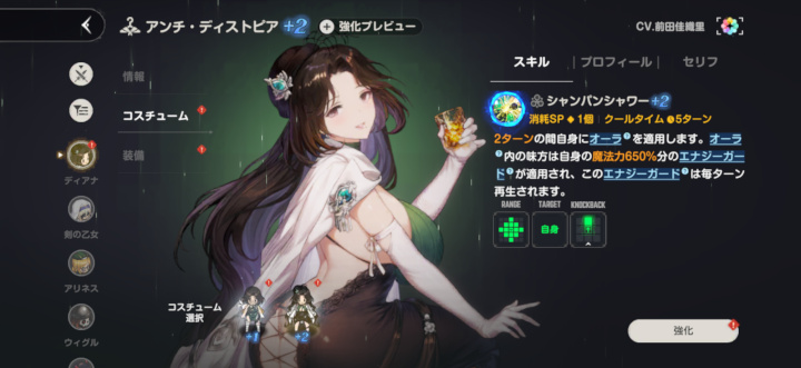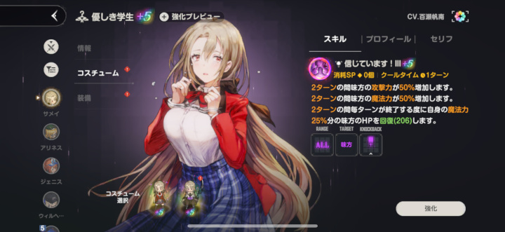 そのキャラのコスチュームを可能な範囲で強化し、攻撃スキルを持つアタッカーは装備強化もしておこう。可能なら『刻印』『覚醒』もしていくとなおよい。