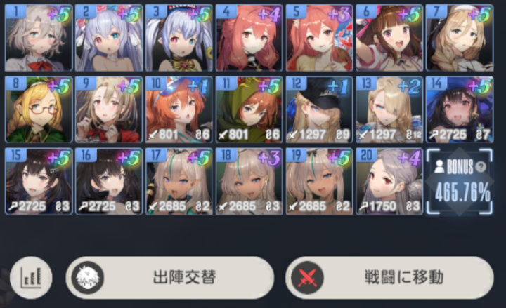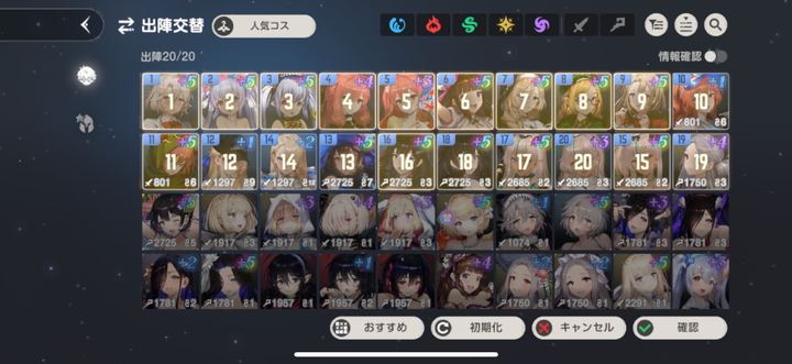 [1] 任意の20のコスチュームで編成を組む。コスチューム単位なので、同キャラをコスチューム違いで複数編成可能(装備は共通)。