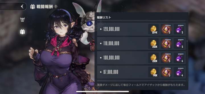 具体的には、過去に出したことがある最大ダメージに応じて、ゴールド(お金)、古代水晶(UR装備の製作に必要)、覚醒の霊薬(キャラの覚醒に必要)が毎日ほぼ自動的に手に入る。毎日9時になるとロエンの使い魔であるアイザックが報酬を持ってきてくれるので、受取ボタンを押すだけでよい。