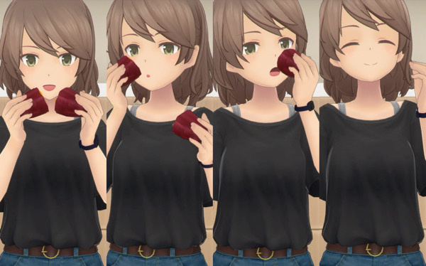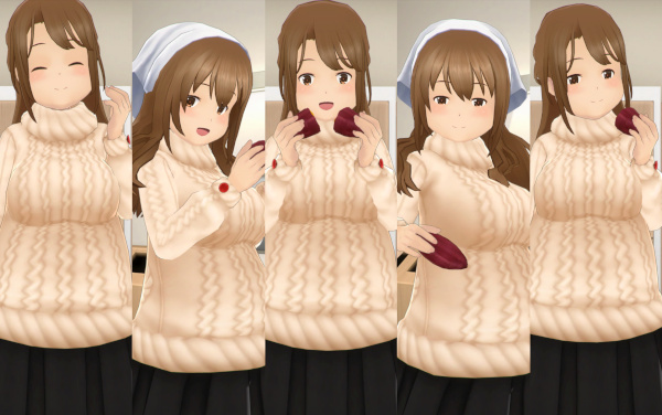 主要キャラ約70人ぶんすべて用意されており、全員ぶんが一気に受け取れるぞ! 基本モーションはみんな同じだが、よく見るとひとりひとりホクホクの焼きいもを割った瞬間の口元などの喜びの表情が違う!