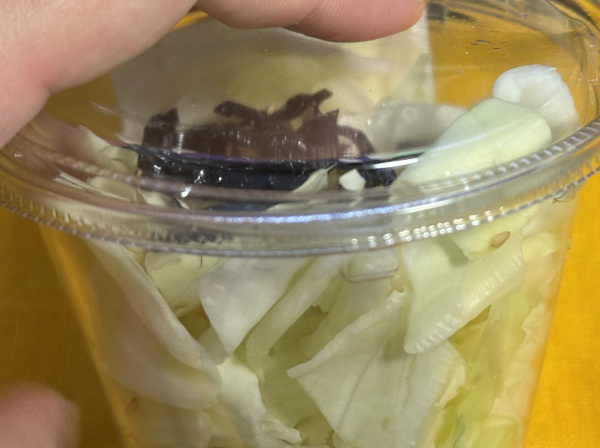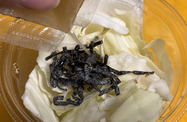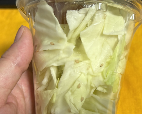 横から見るとこんな感じ。カップにキャベツといりごまが混ざった状態で入っている。