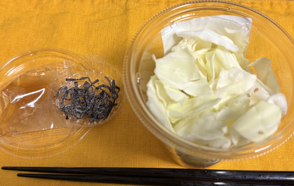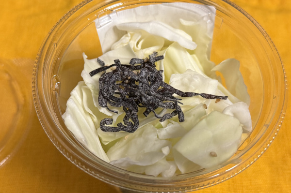 ひとことで言うと、居酒屋のお通しで出てくるような塩キャベツを自分で作って食べる、という商品。原材料はほぼ「キャベツ、塩昆布、いりごま、塩ダレ」のみであり、非常にシンプル。