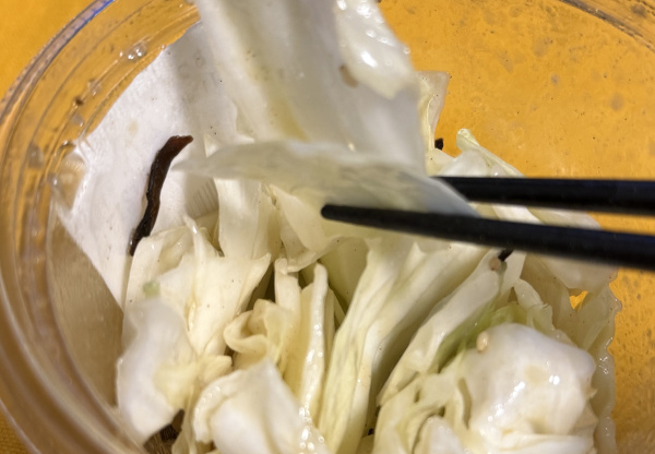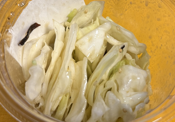 ごま油でコーティングされた、塩っ気たっぷりのおつまみキャベツが完成!