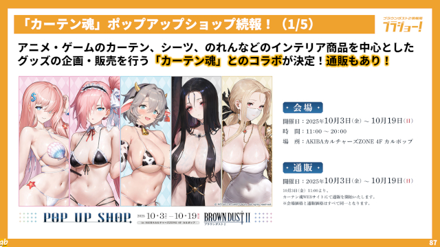 『ブラウンダスト2』というゲームで、2025/10/03(金)から『カーテン魂』とコラボしたポップアップショップが始まっている。秋葉原にお店が出ているほか、通販もある。