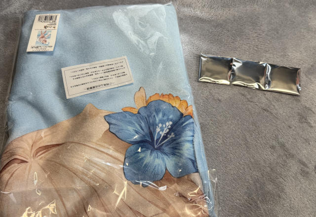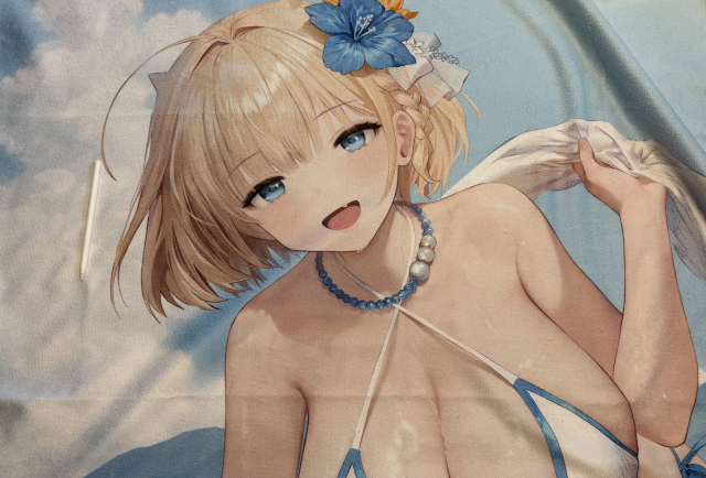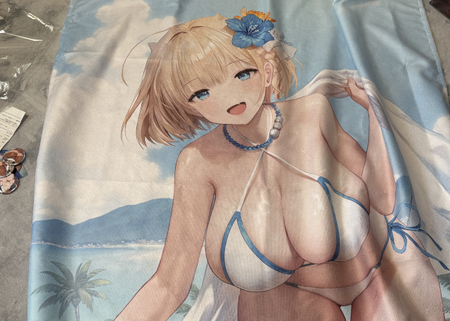 長辺200cmのタオルケットいっぱいにユースティアが描かれているので、等身大どころの騒ぎではない! おっぱいが長さ30cmある!