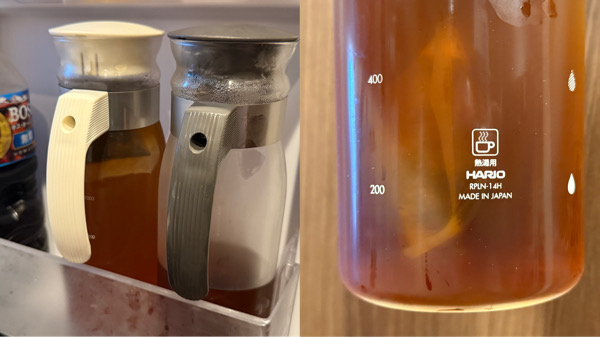 便利すぎてぼくは2本持っており、1本を麦茶用、1本を水出しコーヒー用にしている。見た目も機能もよく、洗いやすさも抜群。さすがHARIO。『ゲムぼく。』はHARIOのいいコーヒースケールを持っているのにいつも大盛りコンビニグルメの計量にしか使わない失礼HARIOユーザーとして知られるが、これをまっとうに愛用しているのでギリギリ許されると信じている。