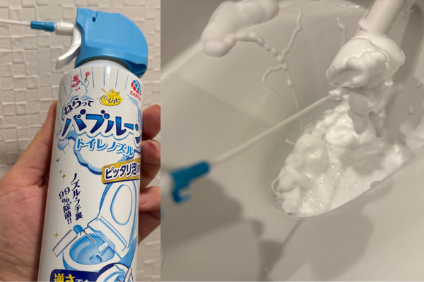 ウォシュレットのノズル掃除と、便器のフチ裏など細かいところの掃除に便利。泡を噴射し、しばらく放置してから洗い流そう。