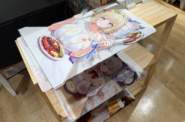 なぜかと言うと、店内には「デートアクリルスタンド」という、ほぼ等身大のユースティア、テレーゼ、ネブリスがテーブルに向かっているイラストのアクリルスタンドが置いてあり、これを自由に使っていいことになっているので、