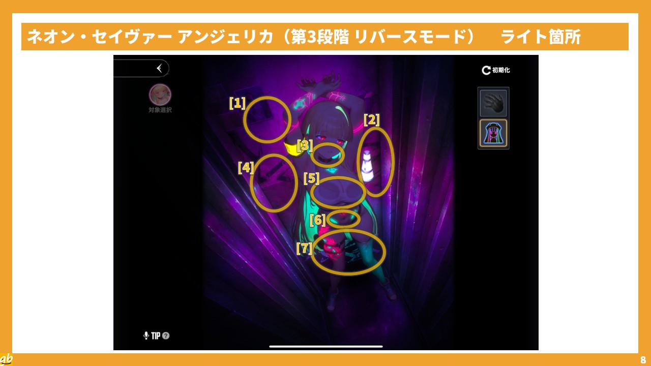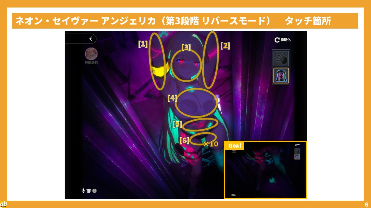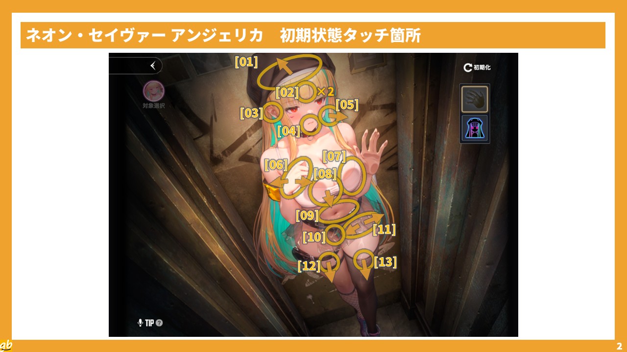 注意点として、アンジェリカが立っているという構図上、横長の画面(例:スマートフォンの横持ち)でプレイしていると上下が見切れやすく、[01](手首)などのタッチ箇所を見落としやすいことが挙げられる。ピンチインでカメラを引いたり、縦画面でのプレイに切り替えたりして、見落としがないようにしていこう。