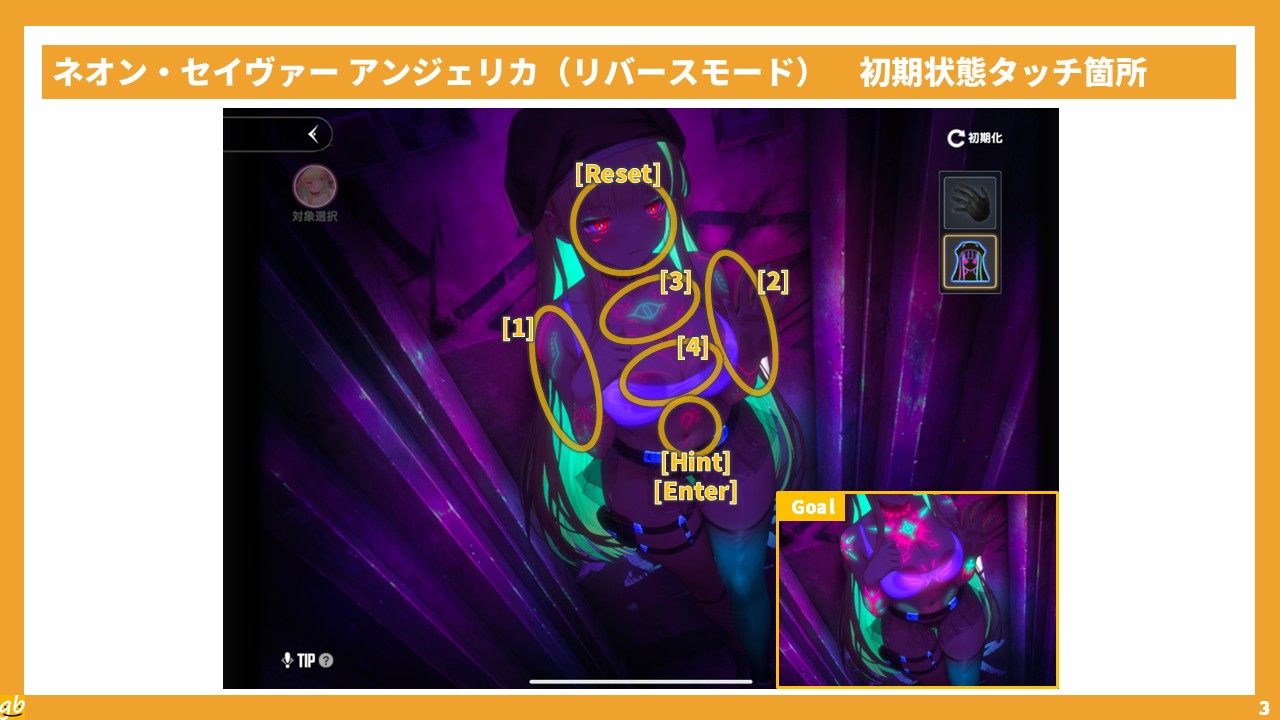 順番がわかったら、[1]~[4]をその順番通りにタッチするのだが、タッチするとアンジェリカの当該部位が光り、複数回タッチすると模様が変わることに要注目。各部位3種類ずつ模様があって、正解の模様は1種類だけ。ハズレの模様だと、次の部位をタッチしたときに光が消えてしまうので、ハズレだとすぐわかる。正解の模様を見つけ続けて、[1]~[4]すべてを光らせて決定ボタン(お腹)をタッチすると、第2段階に移行できる。