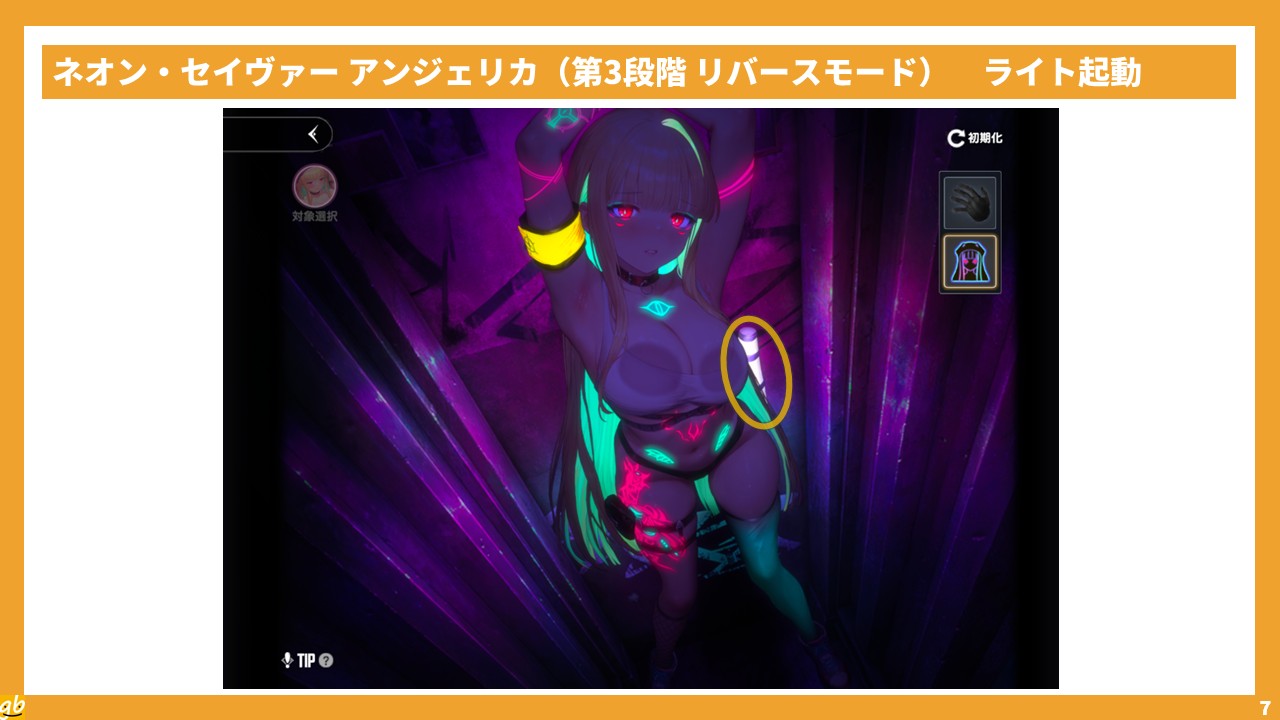 そう、アンジェリカのインタラクションの特徴は、通常の状態暗闇での発光状態があること。ここでは、発光状態のことをスキル名にならって便宜上「リバースモード」と呼ぶ。