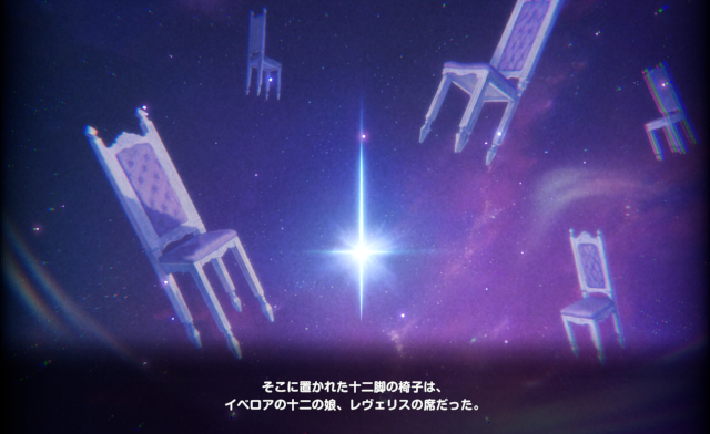 なお、世界が歪むほどの力ゆえに、レヴェリス全員が同時に1ヶ所に集まることはできないらしい。彼女らは、必要があればイベロアが用意した12脚の椅子が浮かぶ異空間に己の「影」、つまり思念体を向かわせ、意思疎通を行う。