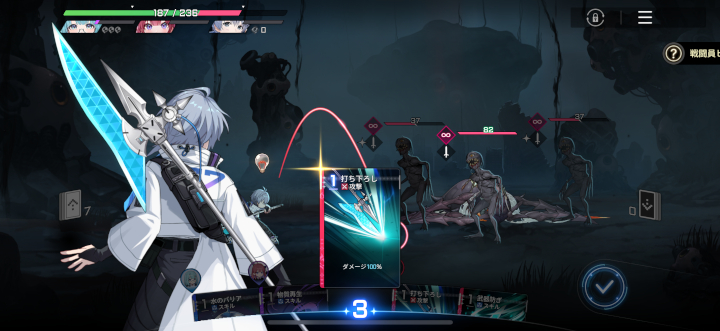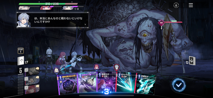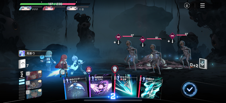 また、強化はその任務中ずっと維持されるので、なるべく序盤の戦闘でヒラメキを発生させておくとあとでラクになる。それを見据えて手札を回していくという作戦が重要だ。