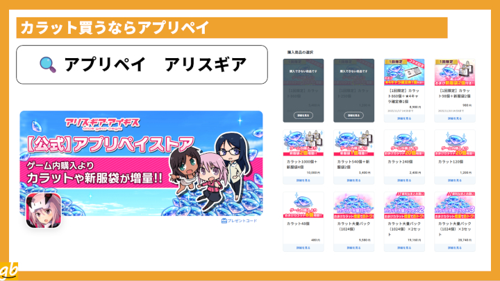 アリスギアは『アプリペイ』というサービスに参画しており、ゲーム外でも課金アイテムを購入できる。
