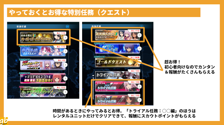 ほかにも特別任務はいろいろあるので余裕があればやってみるとよいが、ぜんぶは大変だし、なかには難しいものもあるので、とりあえず最優先はそのふたつ。