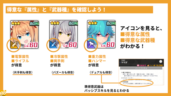 すべてのアクトレスには得意な属性と得意な武器種が設定されており、顔アイコンの左下を見るとだいたいわかるようになっている。より詳細な情報は、顔アイコンを長押しして『パッシブスキル』情報を見ると確認できる。