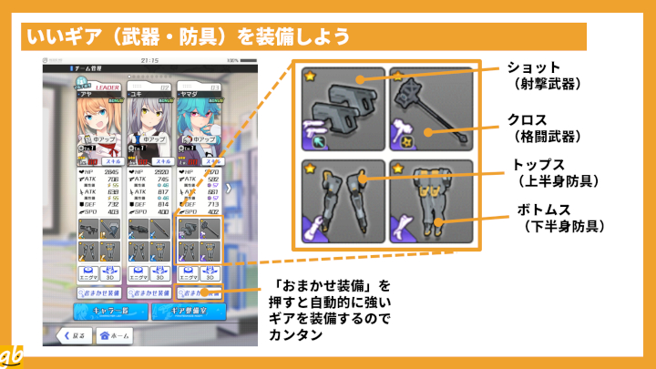 ゲームを進めて新しいギアを入手したら、ホーム画面の『管理』から装備を変更しよう。『おまかせ装備』を選択すると自動的に強い装備を選んでくれるのでてっとり早い。