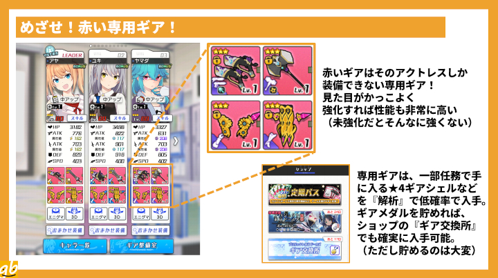 得意なものを装備させてあげると攻撃力が少し上がるなどの恩恵があるのだが、正直、序盤は影響度が小さいし、ギア自体の性能のほうがよっぽど重要なので気にしなくてよい。装備に迷ったときの参考程度に考えておこう。