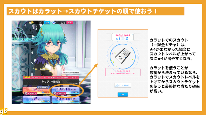 カラットを買う人は、当然ながら★4のアヤ、ユキ、ヤマダを本気で狙っている人だと思うが、その場合、カラットを先に使ったほうがよい。なぜなら、カラットでのスカウト(課金ガチャ)は、★4が出なかった場合に救済措置として一定回数ごとに『スカウトレベル』というものが上がり、次に★4が出やすくなるからだ。