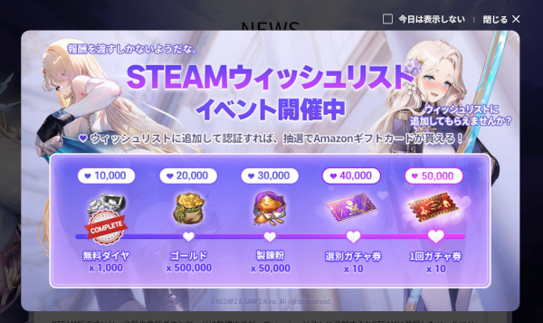 ウィッシュリスト登録数に応じたゲーム内アイテムプレゼントもあるらしいので、いますぐウィッシュリストに登録だ!