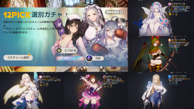 これがあるため、当該コスチュームは12PICK選別ガチャ対象に設定する優先度を落としてよい場合がある。じつはけっこう多いのだが、たとえば特に有用なのは、