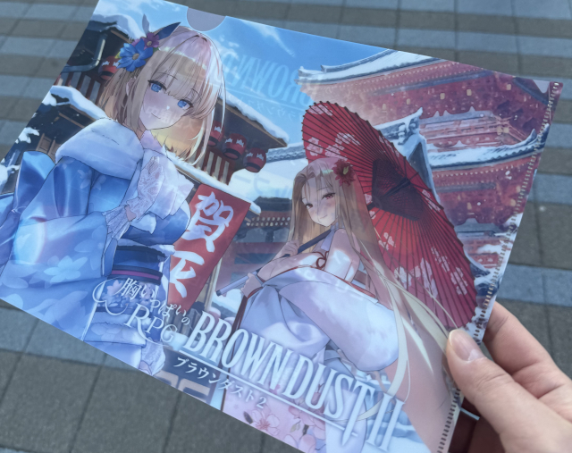 りんかい線 国際展示場駅から会場まで歩いたのだが、道中でブラウンダスト2のクリアファイルが配布されていたのでもらった。日本限定のユースティアとオリビエだ!