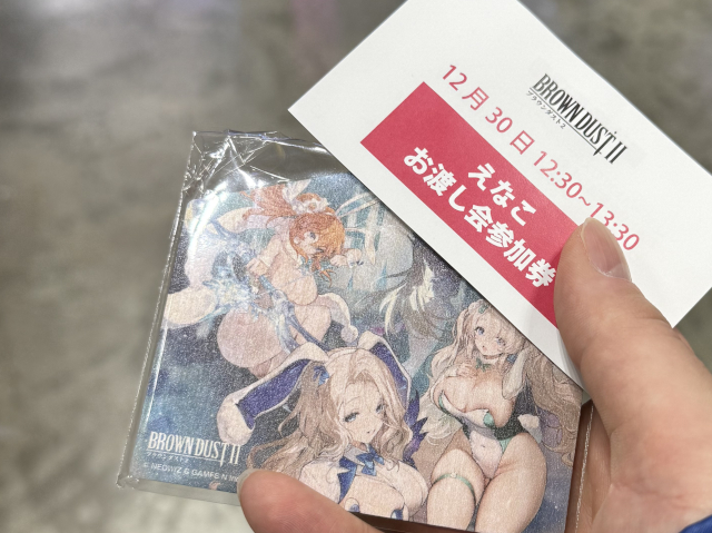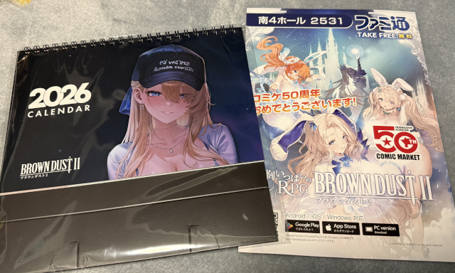 もらう条件は、ブラウンダスト2のアプリのインストール。かなり使い勝手がいいので、朝イチにブラダス2ブースに行って、これだけもらってからコミケ会場を回ってもいいくらい。