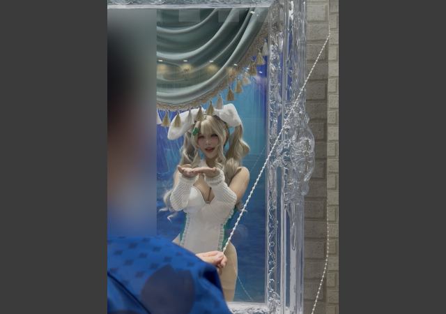 窓の向こうから公式コスプレイヤーさんが現れて、1対1でポーズをたくさん決めてくれる! ぼくはコスプレには疎いが、これが超すごいのはわかる! さすがにドキドキする!