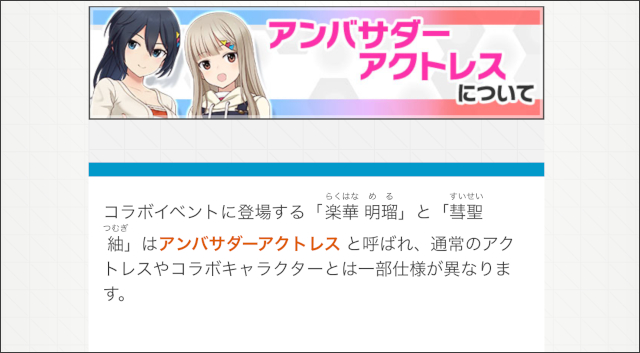 アンバサダーアクトレスとは、ざっくり言うと「通常キャラ」と「コラボキャラ」の中間的存在。「アリスギアのキャラだけど、コラボ先の要素を持ったキャラだよ」という位置づけ。