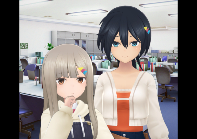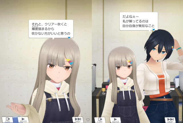 根っからの塗料オタクである明瑠と、仕事として塗料のことを勉強したいが無知な紬。塗料が好きな人は明瑠の目線で、無知な人は紬の目線で感情移入できるし、「明瑠が紬にレクチャーする」という体で自然に塗料の会話が出せる。さらに、展示会という場なので、「ブース来場者に説明する」という体で自然にガイアノーツの商品紹介もできる。