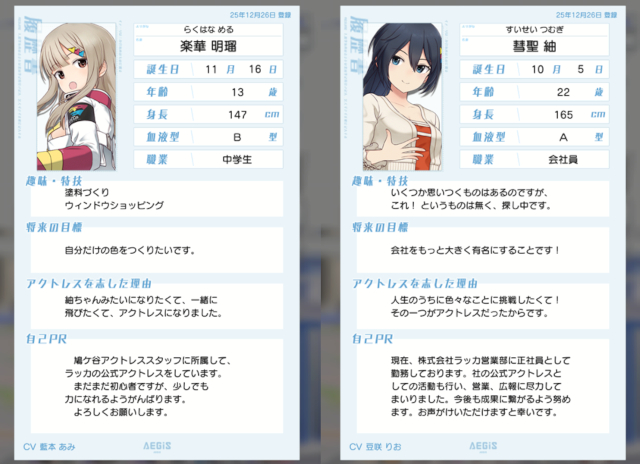 ふたりとも、ガイアノーツをイメージしたと思われる架空の塗料会社「ラッカ」の公式アクトレスという設定。会社の広報活動を兼ねてアクトレス業に励んでいるらしい。