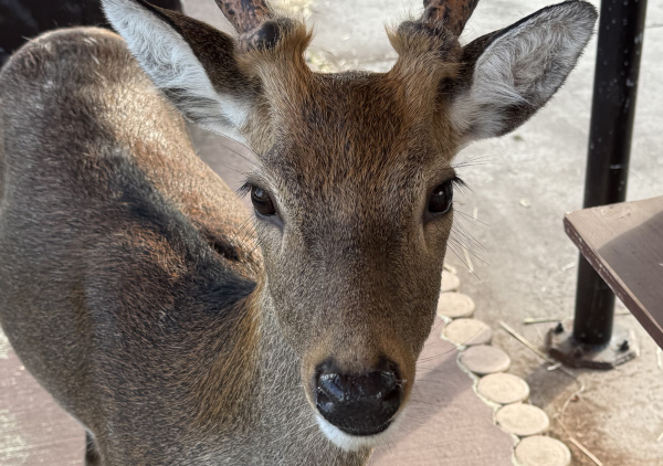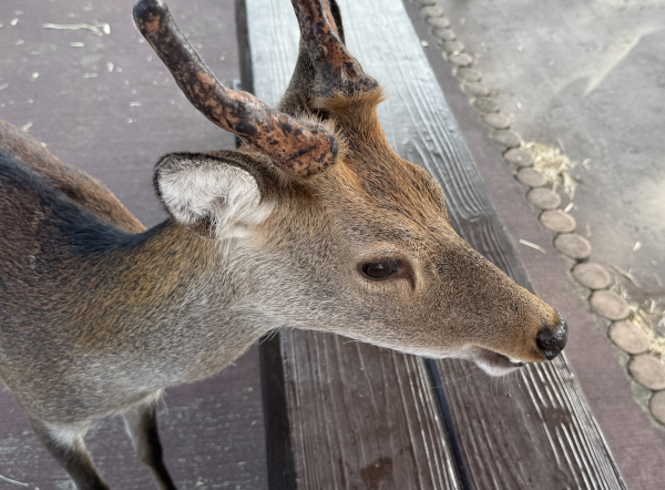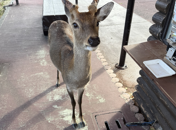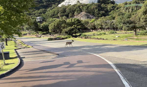 なんと、正真正銘の野生のシカが出現! ここは自然豊かで山林に隣接しているので、野生動物が遊びに来てしまうことがしばしばあるらしい。