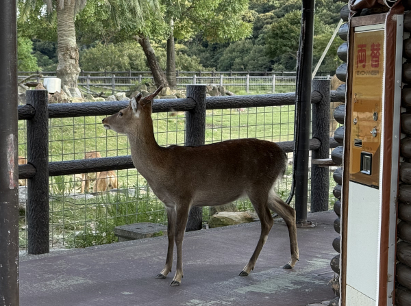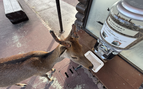 ぼくとシカの読み合いが続く。しばらく遠くを見つめたり電話をするフリをしたりして、「エサを買うつもりはないですよ」という演技をする。
