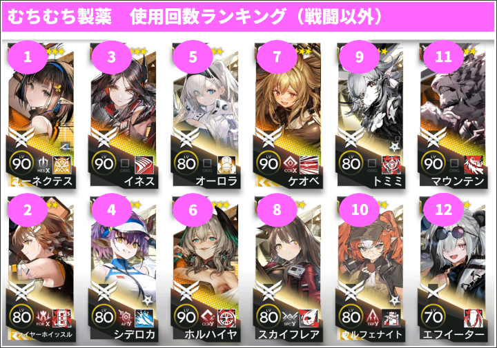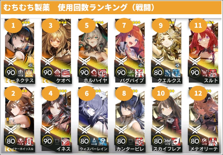 ぼくは持っていないオペレーターが多いが、それでも「強い」として聞いたことがある名前ばかり。7位のイネスと9位のマウンテンだけは我がむちむち製薬のメンバーなので知っている。